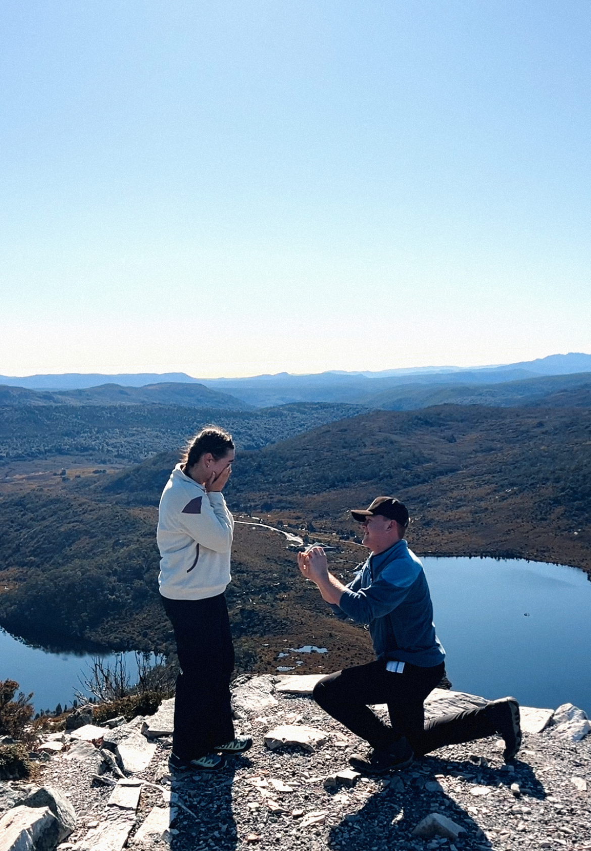During the hike, Zac lagged behind acting weird. At the summit, when it was our turn for a photo, I heard a soft “so…” and instantly knew. Cue the tears & shock - he was proposing!!!! I might have started with an